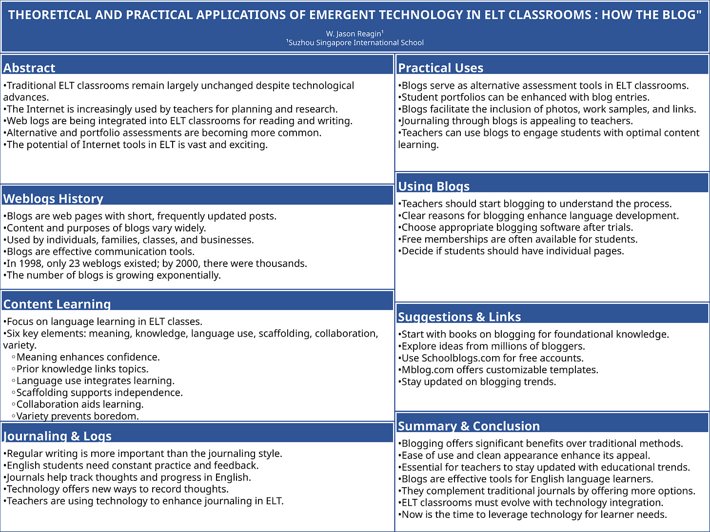 In 2004, I wrote and presented an article about the benefits of blogging in ESL classrooms. Many of the conclusions are still applicable today… Kind of. Below is a summary of the article created by academia.edu Swing by my Academia profile to read the article for free!